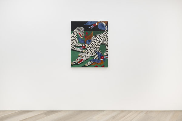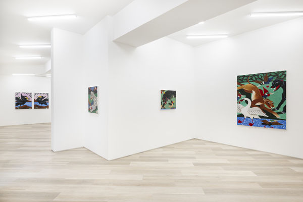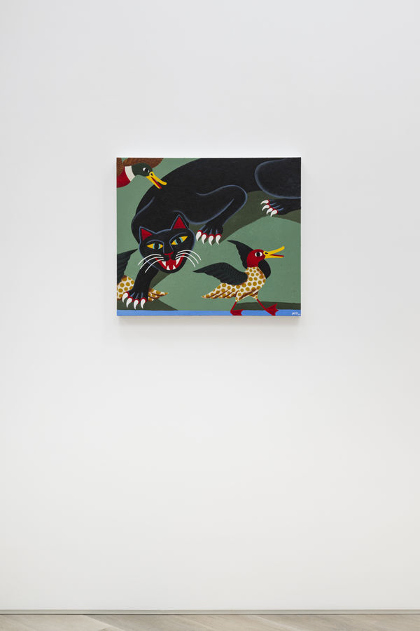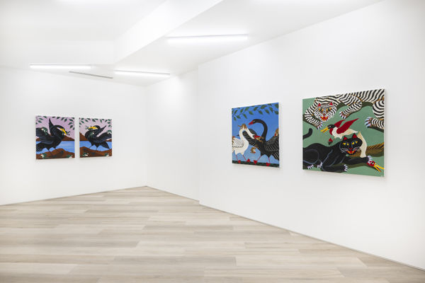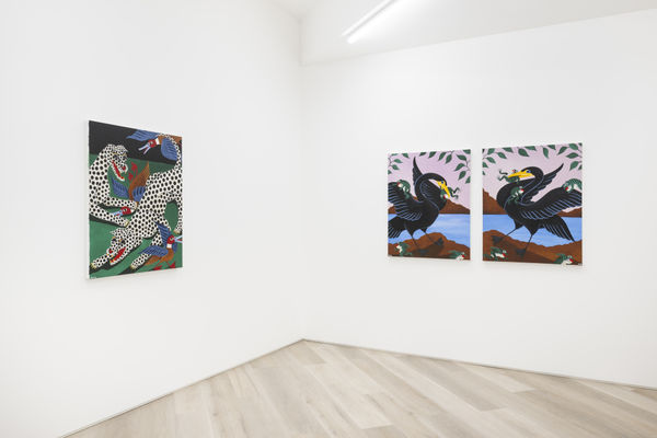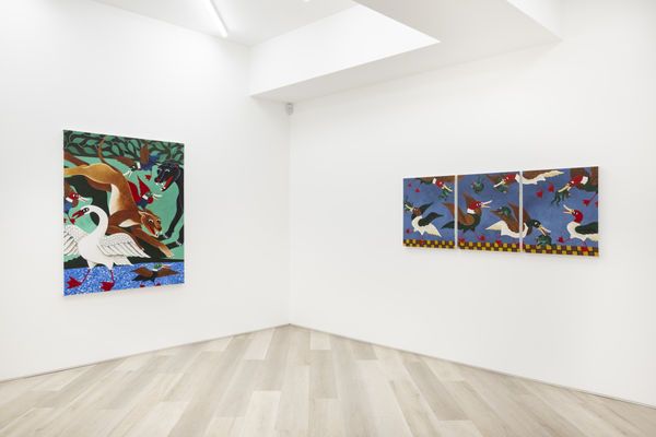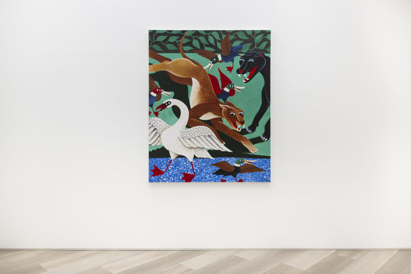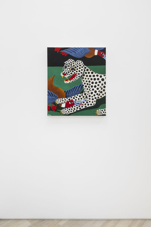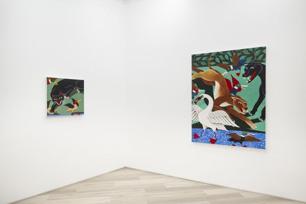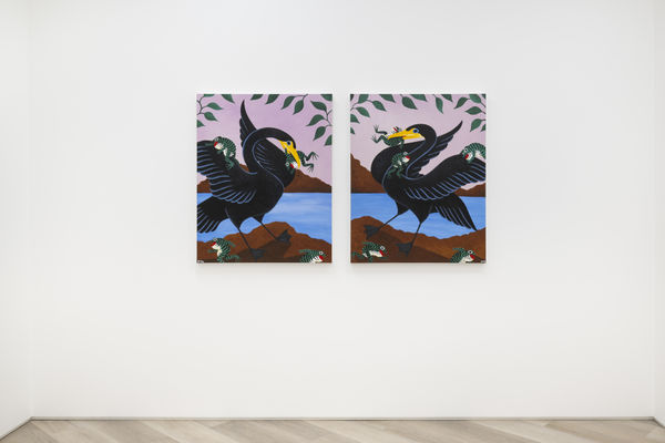 When planning the work for his debut solo exhibition at BEERS, Liam Alvy would take long walks in nature with his dog, in a wooded area near the lakes around his home in Yorkshire. The result is Feast of the Great Lakes, consisting of a series of new paintings in his quirky, recognizable style. The works have a sort of naive charisma to them – situated partway between an obvious painterly prowess and the hyper-stylization that lands within the realm of illustration or even the strongly contoured, recognizable shapes traditionally used in tattoo art. Alvy, a tattooist since his early twenties, has obviously honed his skills as a draftsman, and his prowess as a painter is immediate.