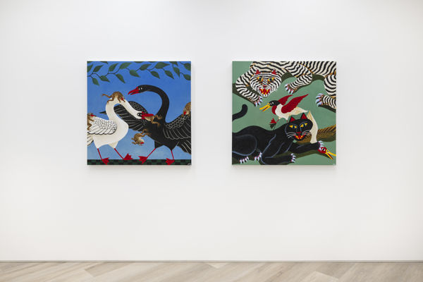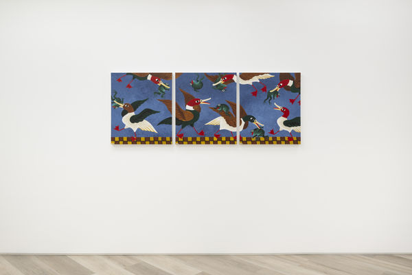 In, What I Talk About When I Talk About Running, Haruki Murakami speaks about inspiration while running in nature. How the seed crystal for creative thought is both omnipresent and invisible, “The sky both exists and doesn’t exist,” he writes. Similarly, Alvy found inspiration for this body of work while running past a family of ducks. “My dog dove into a lake trying to get a duck, and the idea of painting that sparked an excitement within me,” he writes. “Essentially I’m painting what I see on a daily basis walking my dog around the lakes. Ducks, swans, cormorants, and of course occasionally frogs.” He goes on to explain how, as a child, he collected tadpoles in the spring and watched them turn into frogs, when he’d release them. “I’ve often used them in my work to symbolise a struggle, or battle within. Placed in a scene with a cormorant for example, is like the frogs symbolising conquering your demons.”