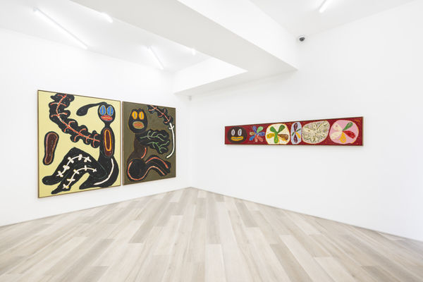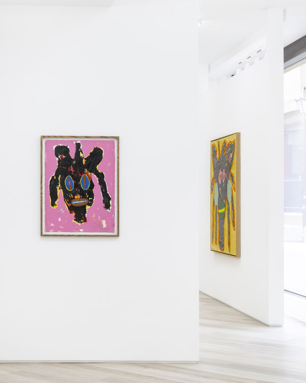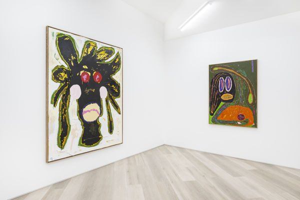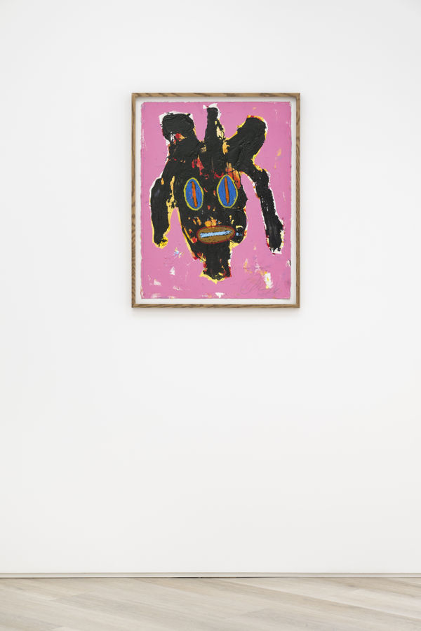 Here, Kabangu has created a sort of repeated narrative through his choice of imagery and motifs: hovering, disembodied, face-like forms – demarcated with broad and frenetic mark-making and bright colours – which seem based as much in the African tribal masks of his youth (Kabangu moved to Denmark at the age of nine), as they appear to subvert the derogatory ‘Jim Crow’ caricature of the 19th Century, or the latter era Golliwog stereotypes that were perpetuated in popular visual media into the 20th Century.