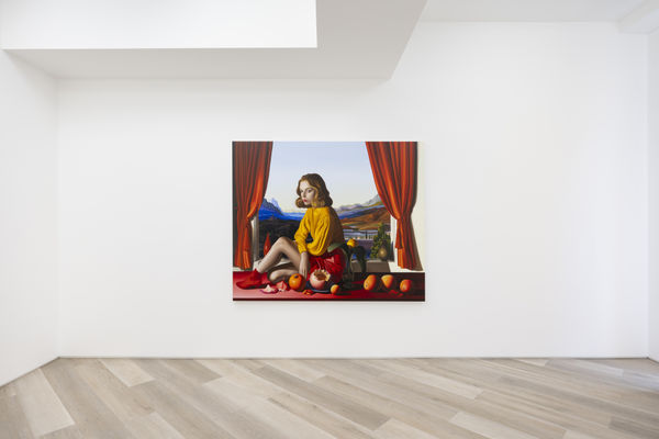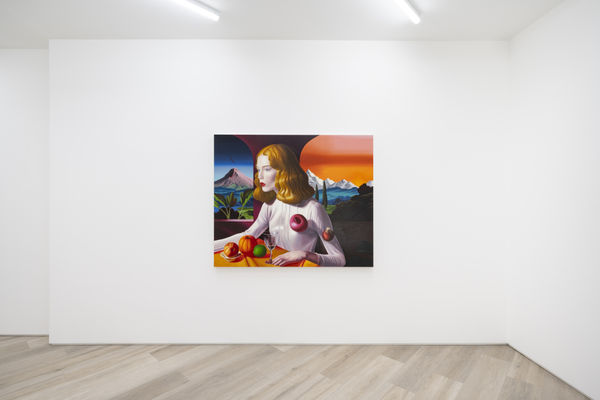 Recurrent to each painting is a female figure, one who seems to be something of a hyper-stylized Victorian era heroines - as likely to be Jane Eyre or a reanimated Emma Stone in Poor Things - she is in fact Cunégonde, the heroine of Voltaire’s Candide, symbolizing the fleeting beauty of youth and the impermanence of life. But she may as well be a modern-day Mona Lisa, presented before a tableau of draped, richly coloured silks that recall Davíd or Veronese, almost as much as they pull from the psychedelic, distant interplanetary landscapes described so vividly in late-era C.S. Lewis, or the off-kilter (sur)realities currently served up by. But Grecu's fantastical worlds have been brought to vivid realization with his meticulous painterly style, his unabashed and magnificent use of saturated colour, and a presentation of ripe and rotund fruits that seem to spill and tumble from the painted surface.