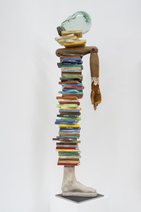 Asking Salgado about the intentions, symbolism, or directive in this collection of paintings – because it’s obviously ripe with his (now) trademark imagery – he becomes deferential, ambiguous, and almost evasive about everything from idea to technique, to presentation, and even the compelling title piece: a rare venture into sculpture which seems – whether through its books or its chair, or its uncanny, discombobulated human parts – to reference the paintings and even the act of painting itself. But also books. Words. Memory. Fallability. That head at the apex is glass. It’s his.