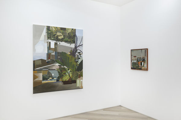 Perhaps the most striking transformation lies in his palette. The formerly vibrant tropical colours have given way to deeper greens and earthy tones, as though absorbing the mistier rhythm of a new landscape. Luminous skies yield to London’s fog — and with it, new elements quietly infiltrate the artist’s visual repertoire. The planes become more organic, while tropical fruits emerge as symbols of longing and belonging — remnants of an origin that continues to resonate, even from afar.
