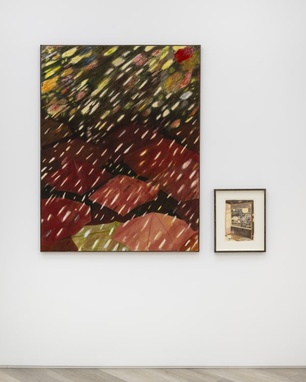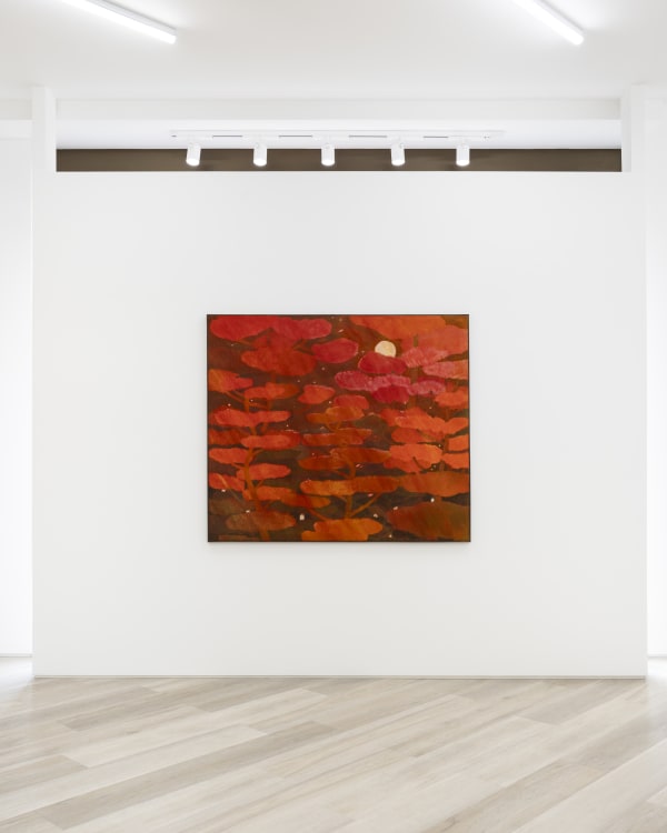 A graduate of History of Art and English, Mahon recalls growing up "in a busy household with a single mum," and themes of safety, home, and the comfort of ritual are evidenced in her work. These themes would be "domestic" but contemporary connotations equate domesticity to femininity, and there's nothing inherently gender-political about Mahon's scenes. They're dreamlike, sure, but they aren't traditionally about "the home" and gendered space as much as they allude to the fantastical. This instinct to "look closer," is tantamount to Mahon's practice. She credits "snapshots, spoken fragments, shifts in memory" and inspiring travels through unfamiliar settings as part of her ongoing artistic dialogue. This show in particular was inspired by her recent travels through Japan: "I'm looking to follow that journey once again. They paintings are heavily infused with imagery from my Japan sketchbooks... the rhythms of travel, or a story book."