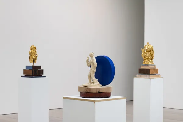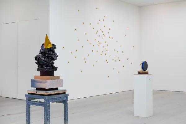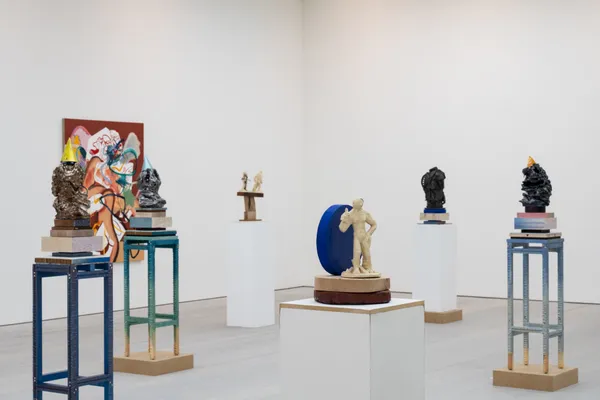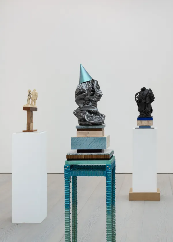 Sebastian Neeb, a German artist who also lives and works in Berlin, is similarly preoccupied with so-called detritus. Just as Moncrief’s paintings shift from attentive realism toward a more volatile, deferential system/language, Neeb finds, shapes, and anchors meaning through the exaltation of cast-off figures and cut-off materials. His “portraits” function as totems of absurdity, in which the artist prioritizes the abject, looking to minor characters or eccentric details from which to extricate a fuller story. Throughout literary history, these minor characters have been reinvigorated and reassessed, from Margaret Atwood's retelling of the Odyssey from Penelope's POV, or Percival Everett's retelling of Huckleberry Finn with James, but rarely are the visual arts able to shift focus in a similar way. But for Neeb, the true heroes are off-kilter, jarring, grotesque, and even a little weird. His mobile statuettes are equal parts seduction and unease, silly and sincere. What we're left with are the cast-off awards for the equally cast-off figures to whom they might belong: an imaginary parade of offbeat characters and their respective awards that would not feel out of place in a Vonnegut novel.