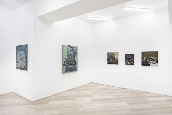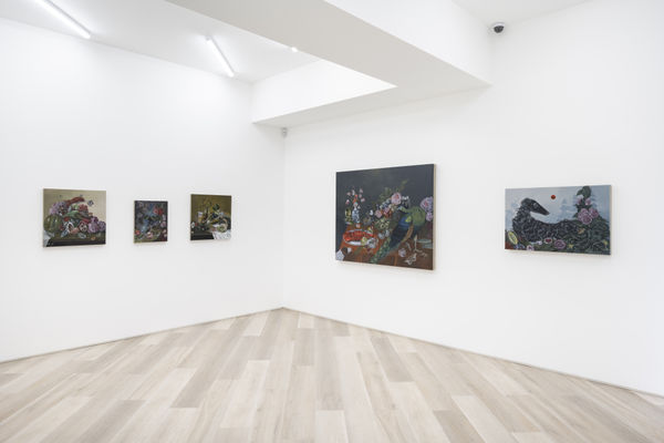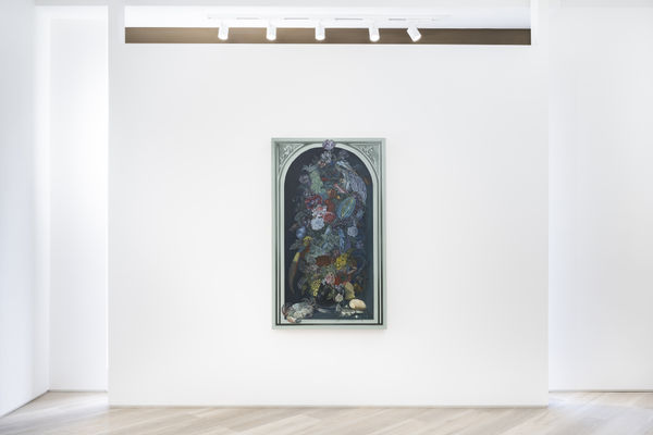 Bockler not only pays homage to the acclaimed 17th-century Dutch rococo artist Rachel Ruysch, whose flower paintings were known for their exquisite beauty and precision but adds her own sense of humor by incorporating several elements in her canvases: her own show dogs, a black cat whose bright eyes spy us from under a table and a couple of mischievous drunk monkeys, animals associated with human folly and the sins of pride and vanity.