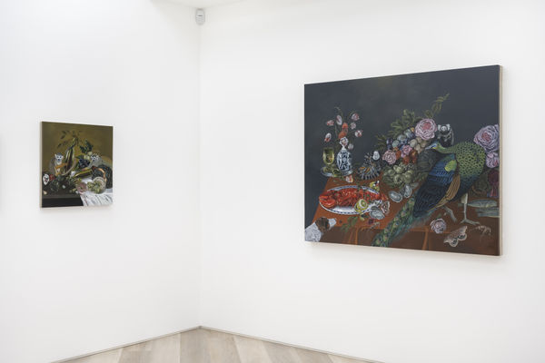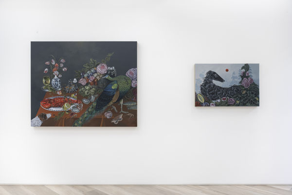 Dutch still-life paintings of the Golden Age often depicted rich and elaborate table settings filled with an abundance of objects, such as flowers, expensive glassware, silverware, tropical fruits, shells, and even live animals such as monkeys or parrots. In the sumptuous A La Carte, Bockler celebrates the genre and era with her own visual vocabulary and suggestive storytelling: sensuality, desire, femininity, and fertility are represented through aphrodisiac foods, such as pomegranates, figs, grapes, and oysters. The lobster, red and prominent, was the Surrealists’ symbol of eroticism and sexual excess, and it’s placed next to the peacock whose vivid colors and intricate patterns are related to pride, luxury, and refinement.