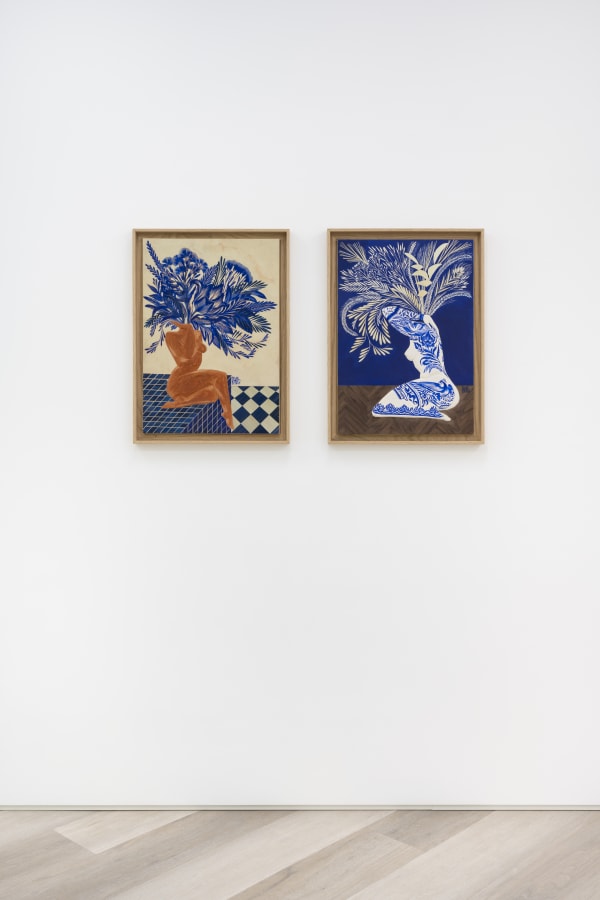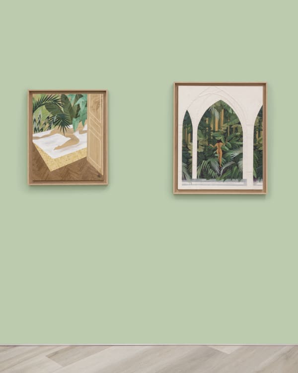 Originally honing her skills with graphic-inspired and street-art works, including paper-cut works and large-scale murals, de Bona’s instantly recognizable style prioritizes bold, stylized shapes and delicate, sensuous forms combined with a confident mastery of composition. But unlike her bold mural works, de Bona finds more intimate spaces of interest with these marquetry pieces, which seem to focus on a singular moment, feeling, or fleeting thought. “It is magical,” she states, “revealing the beauty of little nothings, I pay attention to this ambivalence, and I can be moved by a detail, and find grace in a gesture and sublimate it.” Ultimately, she posits herself not just as a technician of these meticulous, labour-intensive scenes, but also as witness to the debonair glamour and decadence unfolding.