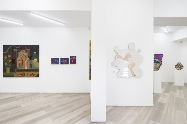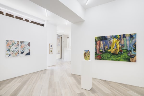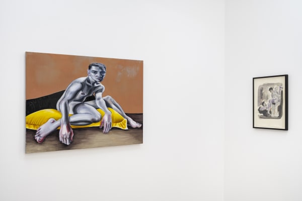 You may or may not notice as your visit this gallery exhibition just how much hands and feet matter to these artists, they act as a real guide to us here. Powerful messages are grasped within each hand, whether they are large and cumbersome, out of proportion, powerful, or with a pointed toe, daintily extended, flexed, slender, fleshy, elegant, there is a strength in touch that every artist is exploring. Themes of Lifting, grappling, balancing counter-weight, the planting of a body on solid ground, appendages reaching out and around, stroking, holding, kissing, these figures are full of love, desiring for a connection, whether that be with us the viewer or within their own narratives, we notice this all via their extremities. Come out and play is an internationally diverse exploration of humanity. It’s themes, told through intimate figuration are highly personal, stories weaved by queer voices which can connect us all in a myriad of ways. These themes are universal. Love.  At times we may feel like a voyeur standing in front of them, yet we have been invited in here, granted with the permission to stare, even though our characters rarely confront us with a direct eye-line. Our new friends are bashful, coy, shy, unable to look at us directly but agreeable to the passing glance over their contoured bodies. The timelessness of a look or of a memory, projects a strong nostalgic feeling throughout, it spins and weaves itself into every scene. With a beautiful sensitivity, and soft nurturing caress, this show is an exploration of the body, whether that be their own or of others, longing for touch is omnipresent. “Come out and Play,” brings artists from all over the world, The Bahamas, Canada, China, Colombia, Germany, Poland, Spain, UK, and the USA. This show’s roster of artists, from totally unique walks of lives and backgrounds, essentially make work to fill a space for when words aren’t enough. All working within a unique intensity and feeling, yet all riffing on the same themes that we witness here, and those themes are love.