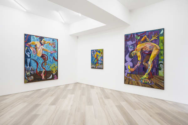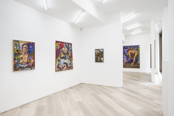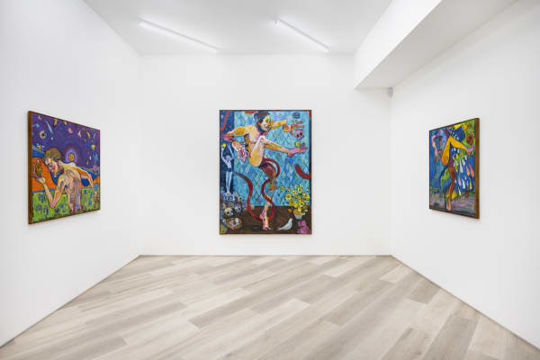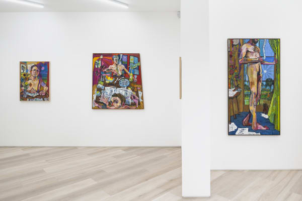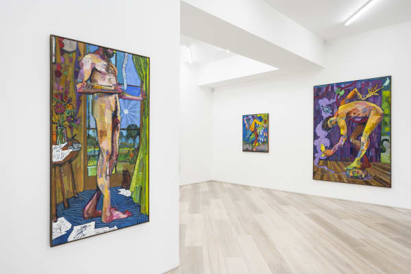 Andrew Salgado’s paintings have evolved greatly in style since the large-scale, painterly portraits he began painting about a decade ago, where large swathes of colour played across the surface to define his subjects. In his most recent work – the representational has given way to the more abstract. Now colourful, symbolic, and compositional elements are the driving force of the painted image, but a complex interweaving of figures remain a common thread. Today his subjects are depicted in a fantastical, often ominous tableaux, with any combination of patterns, abundance, and excess play upon the painted surface, including harlequin-like figures, the motif of a heavy, low-hanging moon; or other unrecognizable figurative shapes sift in and out of the composition, partially obscured or partially revealed. Where there once was a desire to place the figure at the forefront of the image, now there is a kind of harmonious cacophony that creates a sort of chaotically orchestrated puzzle. There are abundant references to the tradition of figurative painting both historic and contemporary: Matisse, Gauguin, and Bacon are all readily recalled; while contemporary greats like Tal R, Daniel Richter, and Peter Doig are also referenced with equal reverie and respect – often like quiet in-jokes for a viewer to catch.