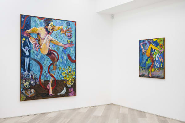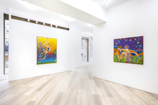 Portraying almost exclusively male figures, regularly nudes, the poeticism in the work goes beyond his earlier concerns about gay identity and is now encompassing all of male identity. Although rarely portrayed with the expressive articulation of emotions, it’s the interaction of his muses with their surroundings and their body language that conveys the emotional and psychological setup of each scene. Borrowing Jarman’s vision of absolute resistance and individuality, with an exception of a couple of bawling figures (Estuary To Sea or Dancing To Nabokov, both 2022), the protagonists are portrayed mostly indifferent, yet firmly grounded within their surroundings. Even when falling from the skies (Dear Daedalus, 2022), they are resolutely creating a space for themselves within sometimes dubious environments (Kestrel Spring, Solstice (Stanyzk’s Escape), Last Parade, Everything Was Beautiful (And Nothing Hurt), all 2022), channeling the distinctive, surrounding-imposed trait of queer nature.