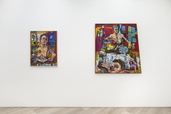 Sincere in his intention while fundamentally playful, quirky, or mischievous in his process and delivery, Salgado is not shy of stylizing his imagery and fully utilizing the materiality of paint and painting as a medium. Moving away from factuality and reason, the nuances become the playground in which the work strives and is able to tell stories about humanity, not through images of faces but with the atmosphere that extends over the entire picture plane. And although packed with drawing, painting, spraying, collaged cutouts, and a riotous color palette, the work doesn’t feel overworked. The fundamentally simple compositions imbued with drama, complex atmosphere, and intense emotional settings are allowing for the classic values and approaches by the likes of Gauguin or Matisse to intertwine with contemporary atmospheres and subjects which are of interest to his contemporaries such as Hernan Bas, Anthony Cudahy, or Louis Fratino. Often pushed to the very edge of becoming colossally intricate and contrived, this quality becomes work’s essence, successfully underlining points the artist is interested in. Bringing some sections awfully close to falling apart, this tension is used to glue the image into a compact whole. The physical, gestural manner of paint application leads to powerful, vibrant images in which slathering and layering of materials evoke a sense of dynamic and movement, while the composition still holds the ambiance of calmness and joy. In the end, the laborious technique reveals both the raw materiality of mark-making as well as the subject matter, placing those two aspects of the work in the same position to compete with each other in capturing and nurturing the viewer’s attention.