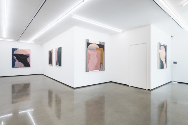 Canadian artist Kathryn MacNaughton deftly interweaves figurative painting with a combination of abstract expressionism, geometric abstraction, and even conventions of the painted still life into one poetic statement. Here, these forms of figuration and still life have been flattened, like their more abstract counterparts, to face the frontal plane of the canvas. In this sense, the canvas and the analog process of the painter’s hand references the computer screen and the digital touch, where these pieces originally begin to take their shape. She states: I wanted my digital work to look raw and handmade. Now that I create “physical” paintings, I want to give the illusion that the work is digital. MacNaughton, who trained and worked as a graphic designer, uses this sort of ‘digital compression’ to her advantage, and one begins to use typically post analog language when discussing her work: masking, layering, colourblocking, silhouette. Here these concepts are paired with more Romantic expressive movements: a scribble dances across a bust, outlined in silhouette, which guides the viewer’s eye around the flattened curves as one guides the finger across a map. The work simultaneously houses a sensuality one aligns with gender tropes: as suggestions of feminine curves play shadow tricks, appearing as vessels or curtains that guide the eye, but also obscure and reveal the picture plane while painterly splatters and curves leap behind and before the picture plane. But also the masculine, referencing brutalist and Modernist architecture: the austerity and monolithic qualities of shape, form, and line, or perhaps even the sharp angles of cacti in the desert. We see references from Robert Morris to Georgia O’Keefe; Diebenkorn to DiChirico, and even a cheeky reference to the highly stylised drawings of Patrick Nagel (more colloquially known as the artist who made Playboy ‘drawings’ iconic of the entire 1980s). The work therefore works in polarities: analog and post analog mark making (ie: the painterly and the digital); feminine and masculine; pragmatism and Romanticism; expressiveness and obfuscation; light and dark. There is a sense of theatricality to her revelations, and it is, in every sense, a cheeky play of light and dark versus form and technique, like boxing with one’s own shadow an art of individual, delicate mastery.