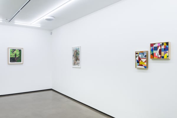 Gregory Hodge constructs illusionary abstractions from a mélange of source material including painted abstract motifs on drafting film, coloured paper and masking tape, before rendering these collages in paint. Using complex and systematic technical processes such as trompe-l’oeil, cast shadows and manipulating paints’ translucent and opaque qualities, the paintings playfully mimic the physical fragility and provisional nature of the source material.