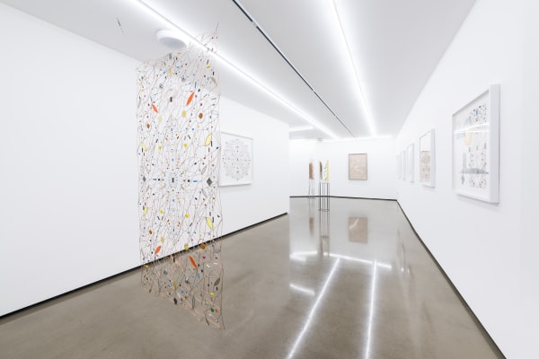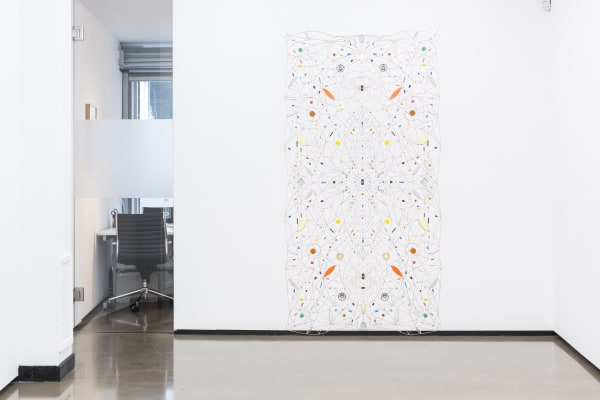 For him, this “realness of reality” is a contrived territory represented through visual metaphor. His landscape is one viewed from above, where the macrocosmic becomes microcosmic, and is herein reduced to a symbolic vista of copper wires, colour-field gradient ‘windows’, electric cables like streams viewed from space, and various other ‘landmarks’ made of unknown components, electrodes, even sand and found objects. As viewers, we maintain the omniscient view of this harmony, where electronic and geometric chaos finds a sort of rythmic, peaceful serenity. Recently, natural scientists have discovered that history, geography, and even human activity – whether viewed in thousands of years, or hourly – falls into patterns of predictable repetition and can be strategically charted out* in predictable courses.