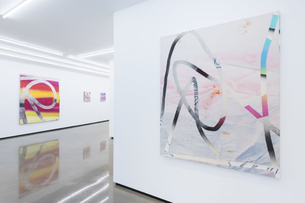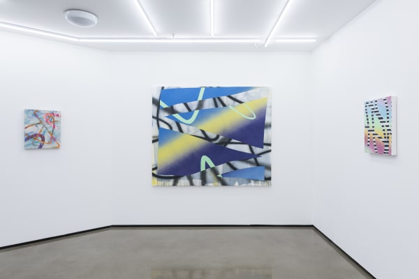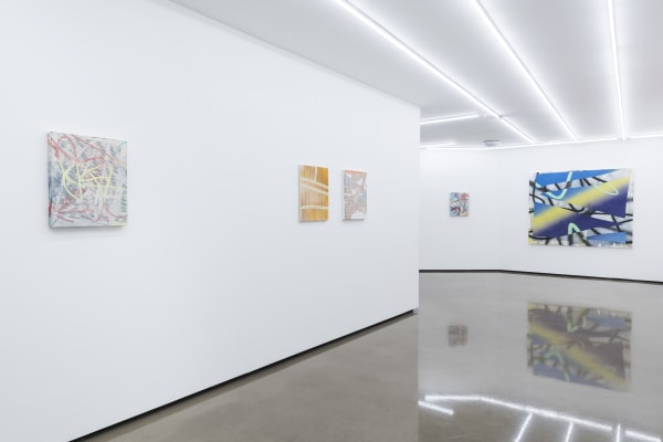 For Freeman, the analogue action of painting doubles as a printed process: where the human hand errs and where the machine has its own shortcomings. So as viewers we begin to further understand that the paintings are meant to be seen as imperfect realisations of the ‘perfect’ images created by digital technology. In her own words: ‘the back and forth actions between the machine and the physical realm of creation produces a hybrid experience that I strive to capture in my work.’ Whereas a digital line would cross a canvas with flawless accuracy and trajectory, Freeman, through the physical act of tracing the line with her own hand, creates imperfections and irregularities that prove the marks to be distinctly and irrevocably human. As such, the works house a sort of frenetic energy – in statis between their apparent digital nature and the painterly gesture.