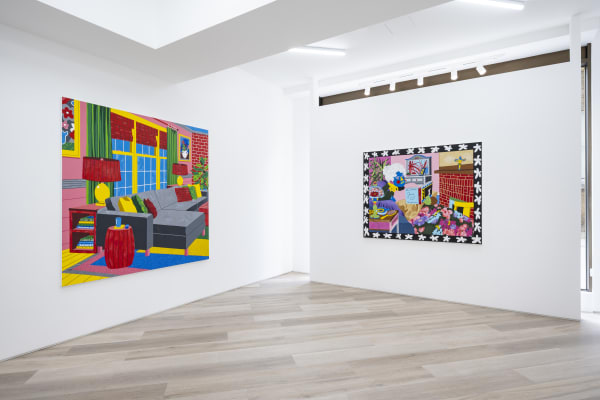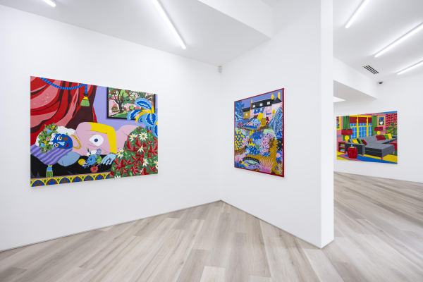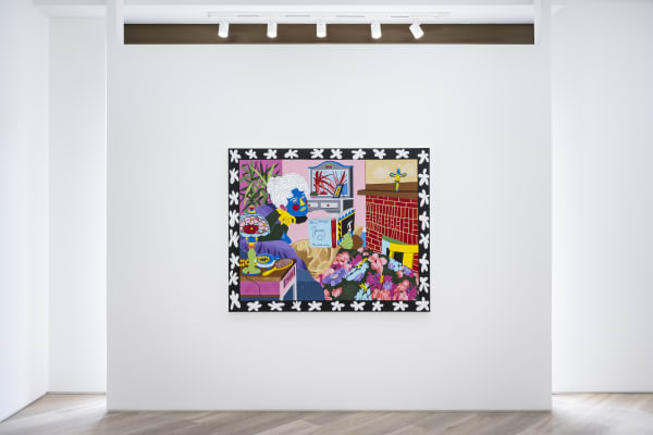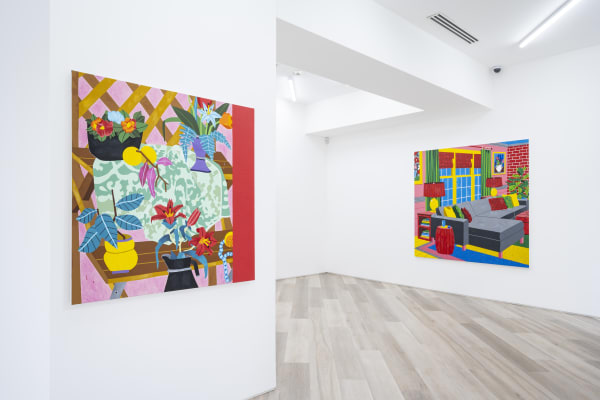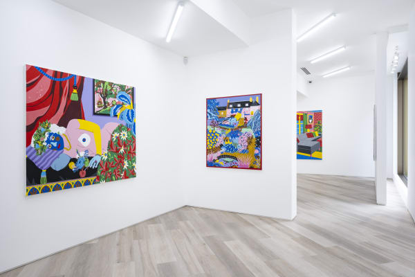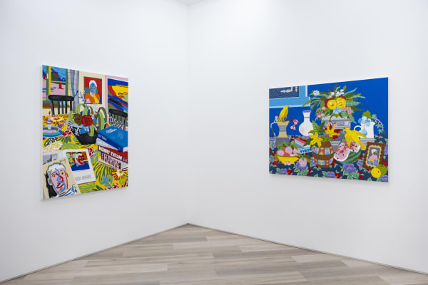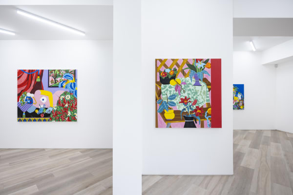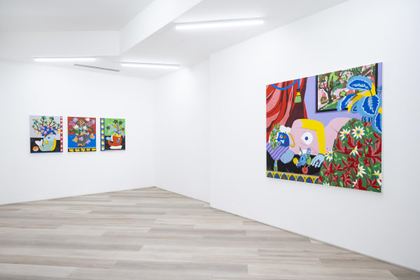Florent Stosskopf is a self-taught painter based in Brittany, France. Stosskopf’s work deftly blends traditional themes and archetypes through a contemporary perspective, reminiscent of Jonas Wood, Guy Yanai, Hillary Pecis, or Paul Wackers, using bright, unrelenting colours that lay out his complex still lives and scenes plucked from the annals of Classical Antiquity, the Baroque movement, and Modernism. As a self-taught painter, Stosskopf’s art-historical endeavours are shared with the viewer: art books on Picasso, Matisse, and contemporary ‘blue-chip’ artists are depicted strewn haphazardly about a busy, albeit still interior space. Do these spaces belong to the artist himself, offering us a unique glimpse into the life and pursuits of a passionate young artist eager to engage in a greater context? Or are they fantastical narratives, carefully crafted based on his own pedagogical and artistic discoveries? The sheer flatness of the works references Stosskopf’s so-called ‘former life’ as a graphic designer, but it is precisely that sensibility that lends itself to such vibrant paintings, teeming with energy and joie de vivre. Constructed like collages, Stosskopf’s paintings use saturated and vibrant colours, remove shadows to heighten both their stylized and disconnect from reality, translating the three-dimensional world into block colours and flat lines, all while retaining the complexity of the image. We are extremely excited to introduce Florent to you with his first major gallery exhibition in his emerging – and what promises to be exciting – painting career.